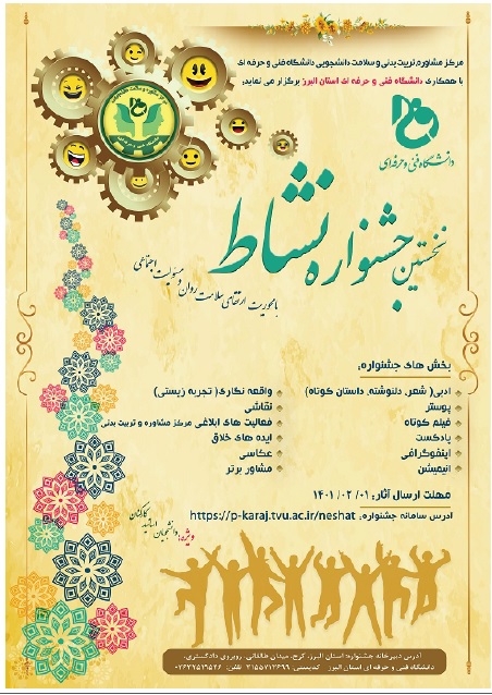 معاونت فرهنگی و دانشجویی در راستای افزایش سلامت جسم و روان خانواده بزرگ دانشگاه فنی و حرفه ای و همچنین بهبود سطح عملکرد مراکز مشاوره و سلامت جشنواره ای ویژه اساتید، کارکنان، دانشجویان، مشاورین و رابطین مشاوره دانشگاه فنی وحرفه ای و با محوریت ارتقای سلامت روان و مسئولیت اجتماعی برگزار می کند: