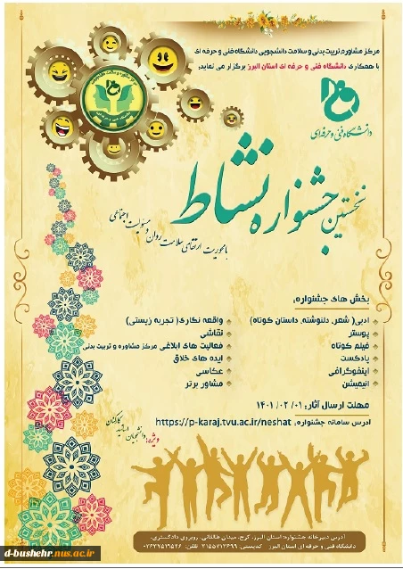 معاونت فرهنگی و دانشجویی در راستای افزایش سلامت جسم و روان خانواده بزرگ دانشگاه فنی و حرفه ای و همچنین بهبود سطح عملکرد مراکز مشاوره و سلامت جشنواره ای ویژه اساتید، کارکنان، دانشجویان، مشاورین و رابطین مشاوره دانشگاه فنی وحرفه ای و با محوریت ارتقای سلامت