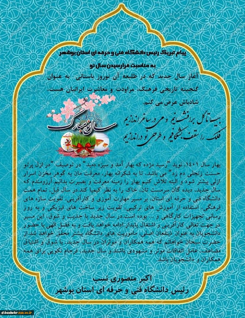 امتیاز دهید : پیام تبریک رئیس دانشگاه فنی و حرفه ای استان بوشهر به مناسبت فرارسیدن سال نو 2 شنبه 28 اسفند 1400 ساعت 14:21