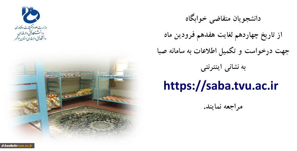امتیاز دهید : دانشجویان متقاضی خوابگاه از تاریخ چهاردهم لغایت هفدهم فرودین ماه جهت درخواست و تکمیل اطلاعات به سامانه صبا به آدرس https://saba.tvu.ac.ir مراجعه نمایند. 2 شنبه 13 فروردین 1401 ساعت 22:25
