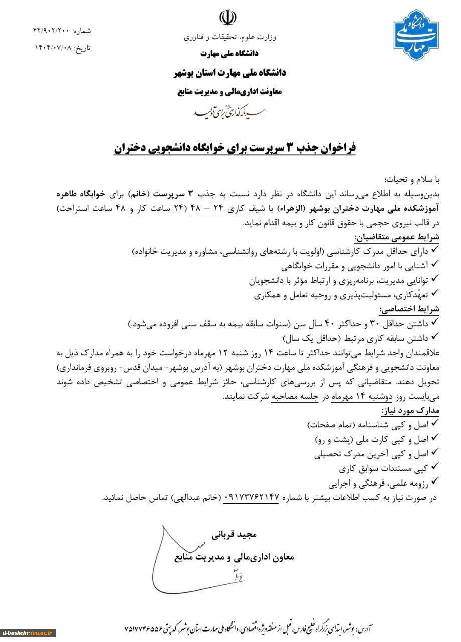 امتیاز دهید : فراخوان جذب سرپرست خوابگاه دانشجویی آموزشکده دختران بوشهر 2 چهارشنبه 9 مهر 1404 ساعت 10:18