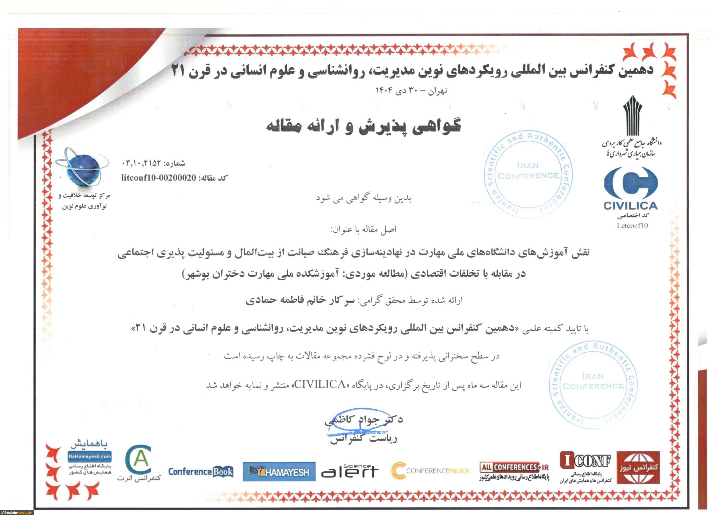 پذیرش و ارائه مقاله علمی استاد آموزشکده ملی مهارت دختران بوشهر در کنفرانس بین‌المللی قرن ۲۱ 2