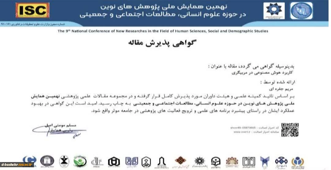امتیاز دهید : پذیرش و انتشار مقاله «کاربرد هوش مصنوعی در مربیگری» در نهمین همایش ملی پژوهشهای نوین علوم انسانی 2 چهارشنبه 3 دی 1404 ساعت 17:23