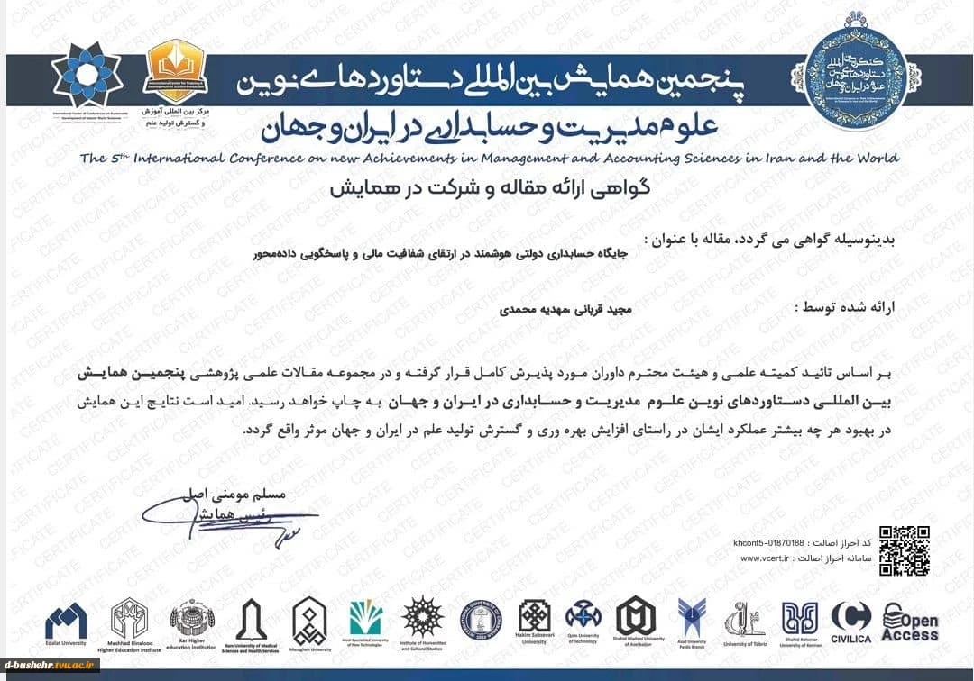 امتیاز دهید : درخشش علمی دانشگاه ملی مهارت بوشهر در عرصه بینالمللی؛ پذیرش مقاله عضو هیأت علمی و دانشجوی حسابداری در همایش بینالمللی مدیریت و حسابداری 2 سهشنبه 16 دی 1404 ساعت 16:43