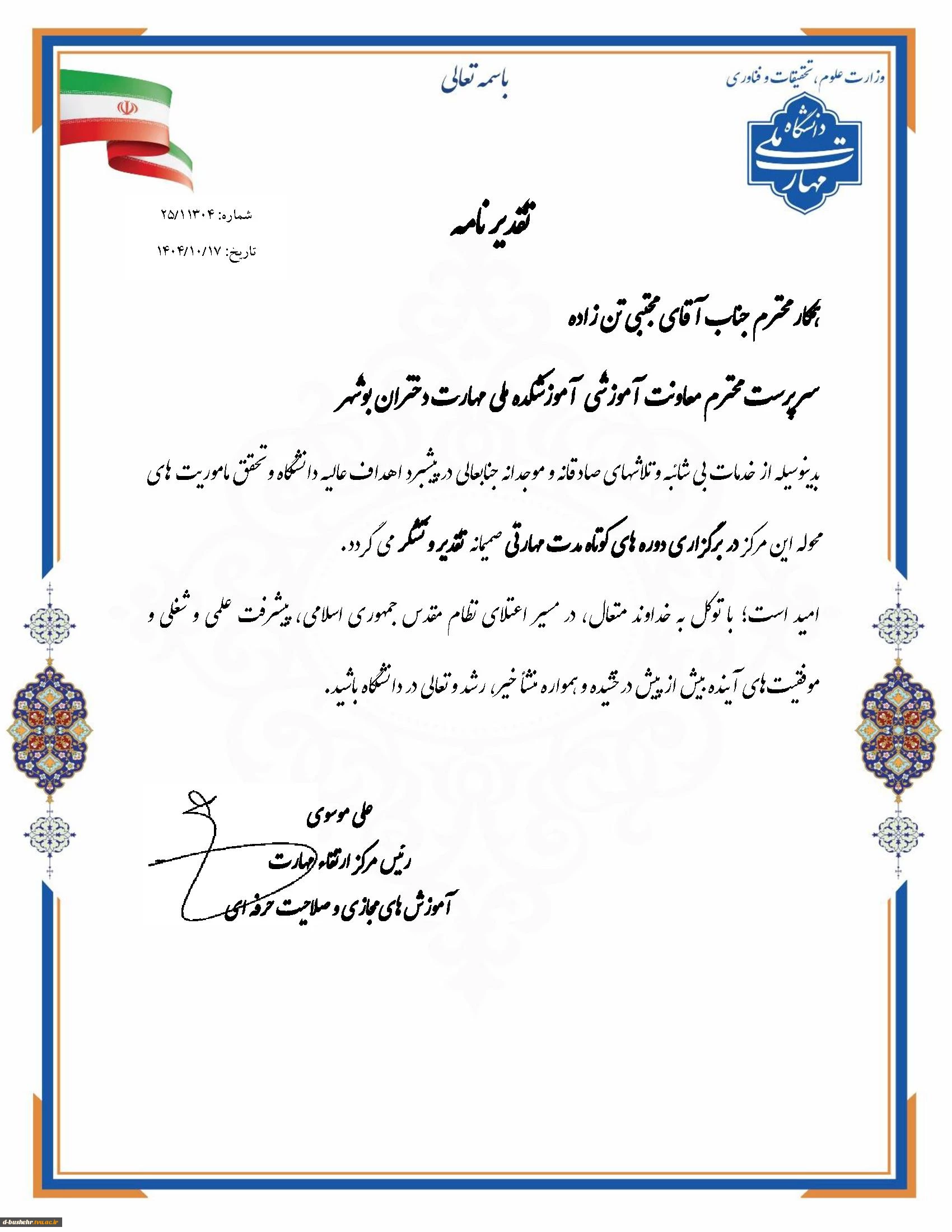 امتیاز دهید : تقدیر از عملکرد نه ماهه آموزشکده ملی مهارت دختران بوشهر در حوزه درآمد، دوره و درآمد- دوره مطابق تعهدات اعلامی 1404 3 شنبه 20 دی 1404 ساعت 17:27